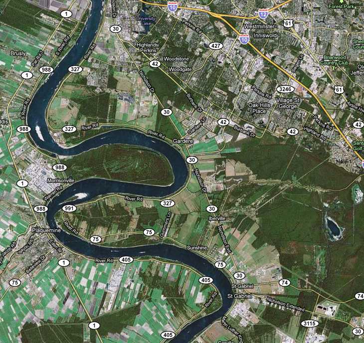 Now that it's become public, it appears they WILL get around to raising and leveling that levee before the river comes up enough to run over the top. We hope. Below is a map showing a broader view of those sharp curves in the river just north of us. We live in St. Gabriel at the point of the river on the bottom right. That low point in the levee is at the point where the river comes close to 30 in the center of the photo (the loop north of our place). Note that there is no construction in that area between the two loops, just low farm land, so if the river WERE to overflow there it would run out to the homes in that area VERY quickly. So I'm really grateful to that TV station for publicizing the problem.